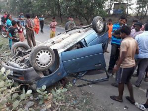 अहले सुबह करीब 6 बजे हवाई अड्डा से टहल कर आ रहे कामेश प्रसाद( 45)एवम बीर बहादुर प्रसाद (40)दोनों पटवा टोली निवासी को मारुती 800 कार संख्या BR20 9611ने पिछे से टक्कर मार अनियंत्रित हो कर पलट गई ।चालक कामेस्वर यादव कथारा निवासी को भी हल्की चोट आई है।सभी घायलों को स्थानीय लोगों ने आ ई एल अस्पताल पहुंचाया डॉक्टरों ने कामेश्वर प्रसाद और वीर बाहदुर की हालत देख बेहतर इलाज हेतु रांची रेफर कर दिया ।