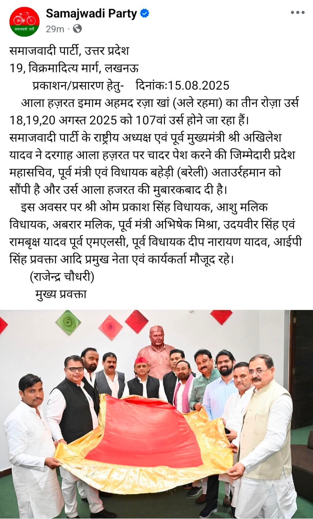इसके बाद कांग्रेस की देखा-देखी समाजवादी पार्टी ने भी चादरपोशी की परंपरा शुरू कर दी लेकिन समाजवादी पार्टी की ओर से भी स्थानीय स्तर के नेताओं को भेजकर ही खानापूर्ति कर दी जाती रही। पहले तो सपा की ओर स्थानीय स्तर पर ही चादर खरीदकर पार्टी पदाधिकारी रस्म अदायगी कर देते थे। वर्ष 2024 में पहली बार खुद अखिलेश यादव ने पूर्व मंत्री अता उर रहमान के हाथों चादर भेजी तो पार्टी के नेताओं में आपस में ही क्लेश हो गया और इस विवाद ने अखबारों में तमाम सुर्खियां बटोरीं। असल मायने में इस बार अखिलेश यादव ने आधिकारिक तौर पर एक प्रतिनिधिमंडल की घोषणा करते हुए चादरपोशी को तवज्जो दी है। बाकायदा सपा के मुख्य प्रवक्ता राजेंद्र चौधरी की ओर से इस संबंध में विगत 15 अगस्त को एक प्रेस विज्ञप्ति जारी की गई। इसमें कहा गया है, ‘आला हज़रत इमाम अहमद रज़ा खां (अले रहमा) का तीन रोज़ा उर्स 18,19,20 अगस्त 2025 को 107वां उर्स होने जा रहा है। समाजवादी पार्टी के राष्ट्रीय अध्यक्ष एवं पूर्व मुख्यमंत्री अखिलेश यादव ने दरगाह आला हज़रत पर चादर पेश करने की जिम्मेदारी प्रदेश महासचिव, पूर्व मंत्री एवं विधायक बहेड़ी (बरेली) अताउर्रहमान को सौंपी है और उर्स आला हजरत की मुबारकबाद दी है।’