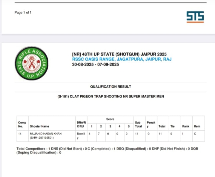 खेलों की दुनिया में अक्सर कहा जाता है कि उम्र केवल एक संख्या है। इस कहावत को सच साबित किया है वरिष्ठ कांग्रेस नेता और राष्ट्रीय स्तर के मशहूर निशानेबाज नवाब मुजाहिद हसन खां ने। 70 वर्ष की आयु में भी उन्होंने अपनी सटीक निशानेबाजी से यह दिखा दिया कि जज्बा और मेहनत अगर कायम रहे तो सफलता उम्र की किसी सीमा में बंधी नहीं होती। जयपुर में 30 अगस्त से 7 सितम्बर तक आयोजित 48वीं यूपी स्टेट शॉटगन प्रतियोगिता में नवाब मुजाहिद ने ट्रैप शूटिंग में गोल्ड मेडल जीतकर न केवल बरेली बल्कि पूरे उत्तर प्रदेश का नाम रोशन कर दिया।