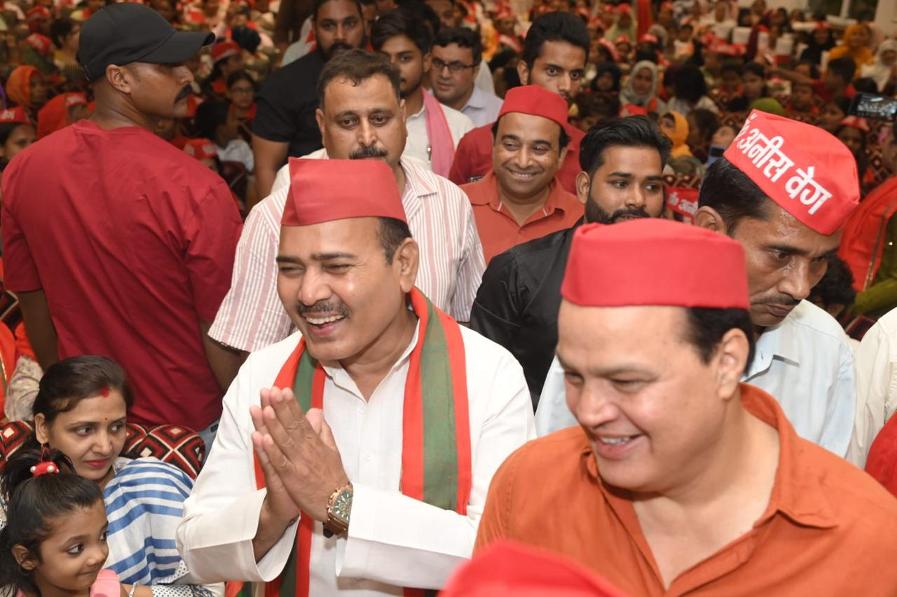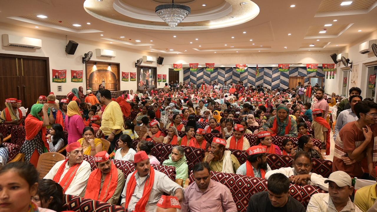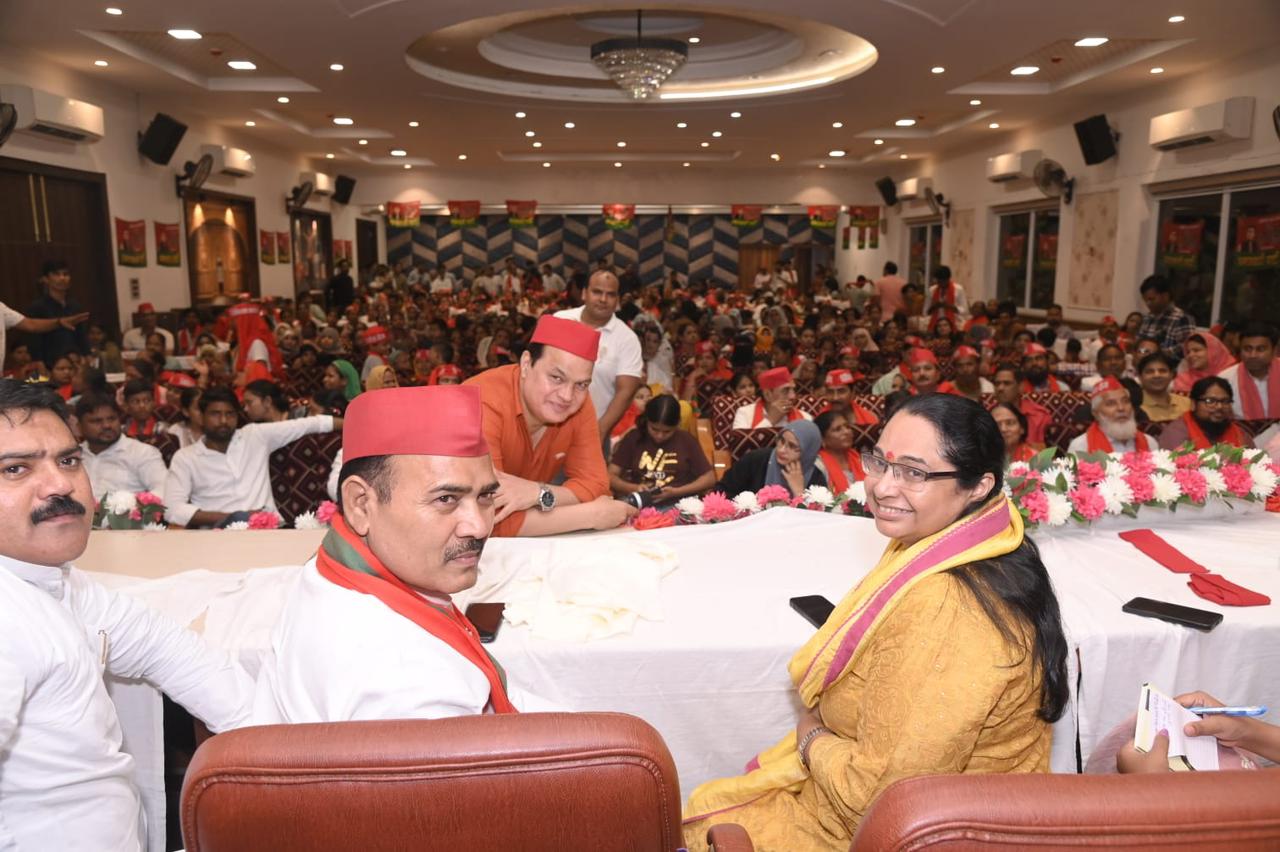 The auditorium echoed with slogans like “Jai Akhilesh, Tay Akhilesh” and “Anees Beg Zindabad”, as thousands of women workers and supporters gathered in solidarity. The atmosphere was filled with slogans, claps, and sheer enthusiasm, signaling a strong show of strength by the PDA.