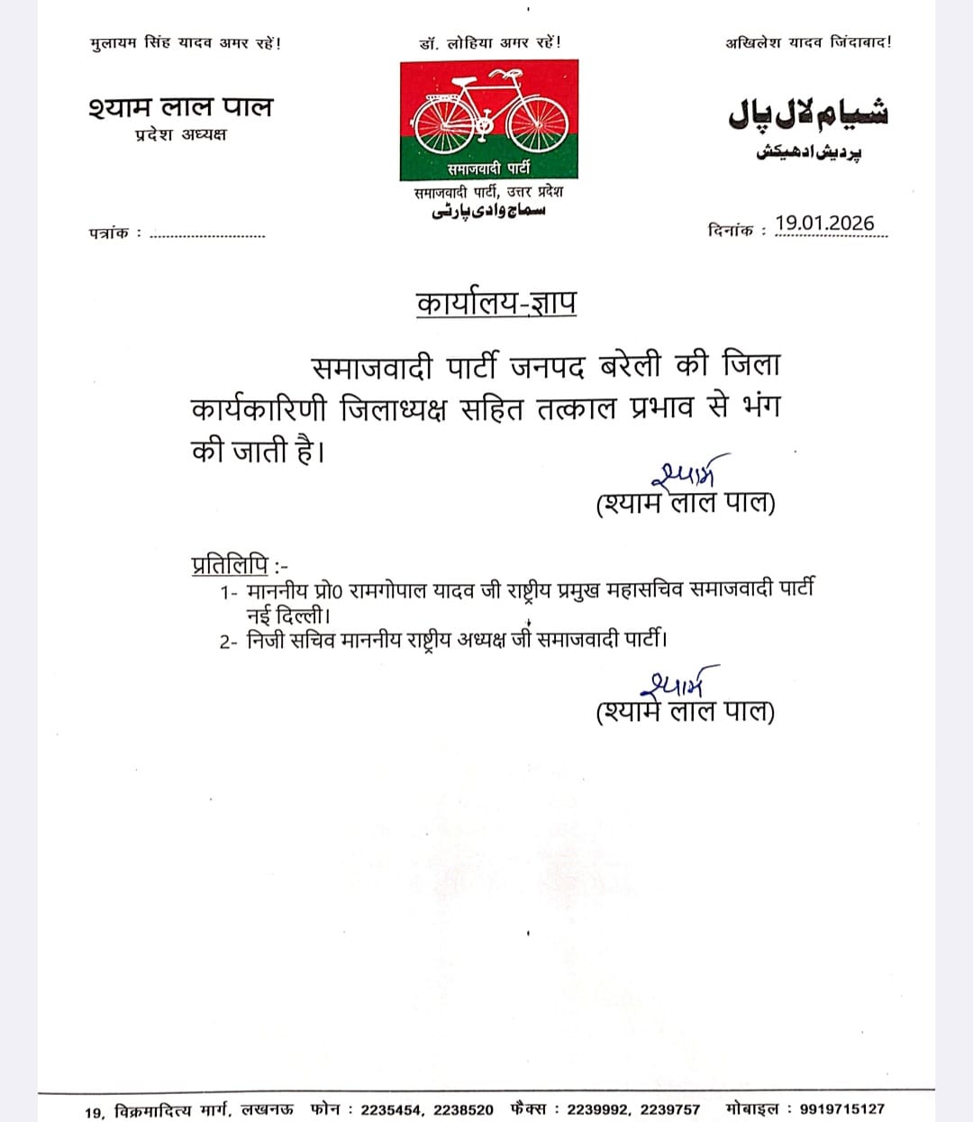 जारी पत्र में स्पष्ट किया गया है कि समाजवादी पार्टी जनपद बरेली की जिला कार्यकारिणी, जिलाध्यक्ष सहित, अब प्रभावी नहीं रहेगी। यह निर्णय तत्काल प्रभाव से लागू कर दिया गया है। पत्र की प्रतिलिपि पार्टी के राष्ट्रीय प्रमुख महासचिव प्रो. रामगोपाल यादव और राष्ट्रीय अध्यक्ष के निजी सचिव को भी भेजी गई है।